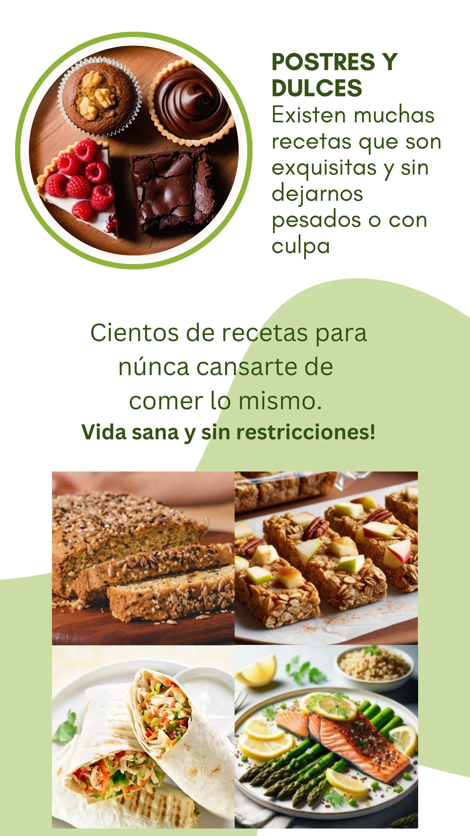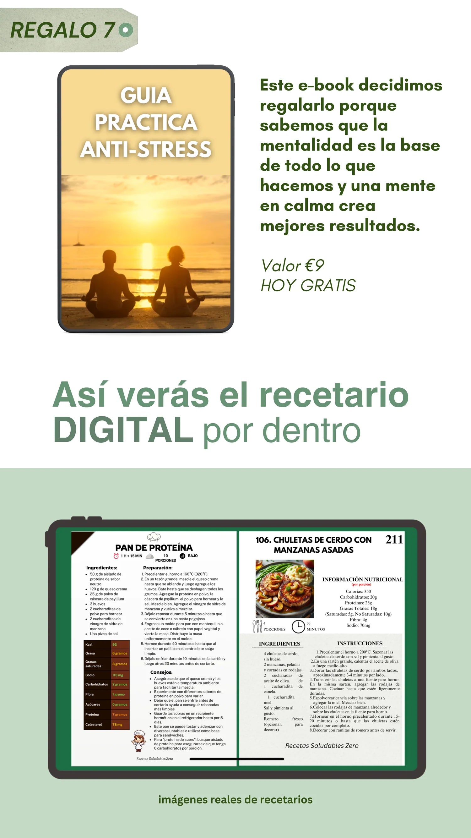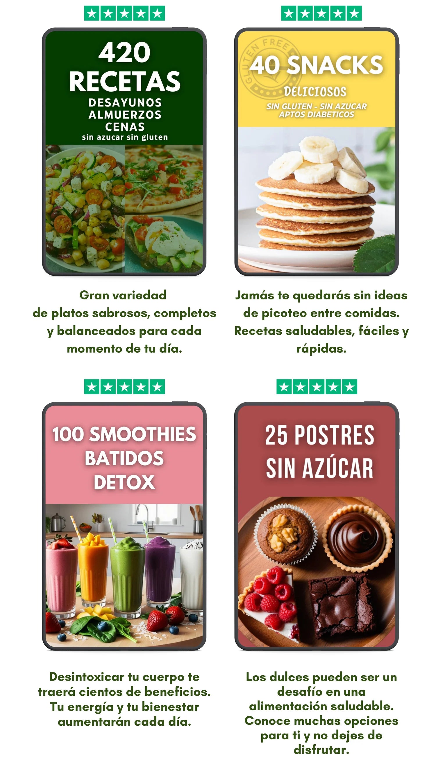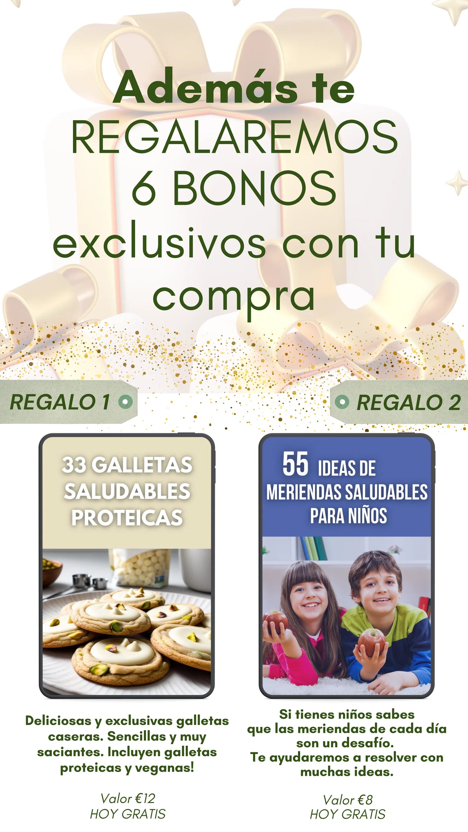 Recibís el ebook completo en formato digital (PDF) con más de 1000 recetas sin azúcar y sin gluten + 20 regalos exclusivos que incluyen planes de comidas, listas de compras y guías rápidas. Todo esto se entrega junto en un Pack Saludable Premium.